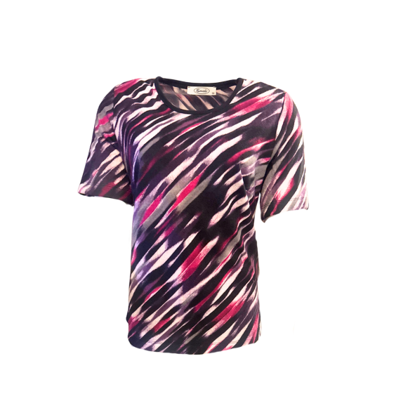 Het bijpassende shirt heeft korte mouwen en een ronde hals, afgewerkt met een effen bies. Het rechte model zorgt voor een soepele val en maakt het eenvoudig te combineren met diverse broeken of rokken. Dankzij de zachte jersey kwaliteit blijft het shirt ook na veelvuldig dragen mooi in vorm.